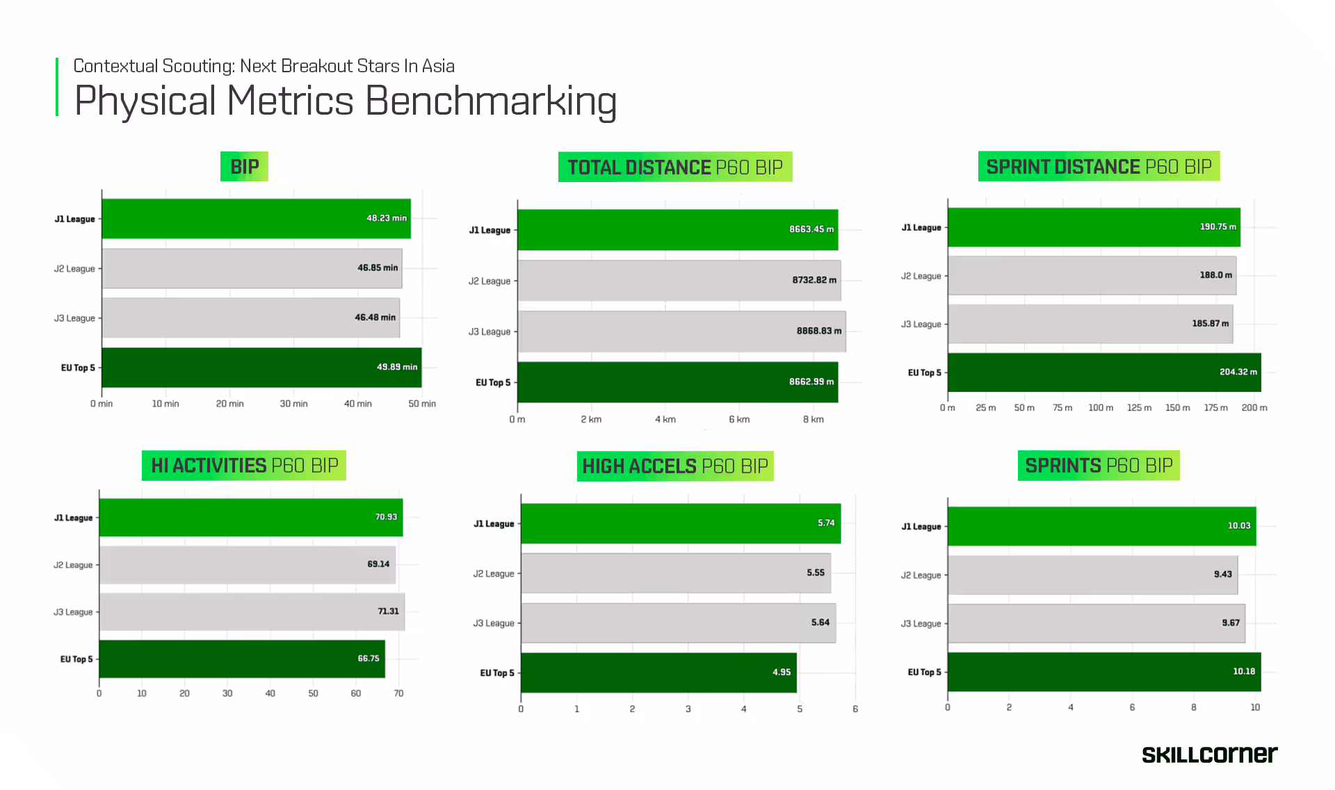 We can further support these findings with recent physical data. In the bar charts below, we benchmarked physical metrics from the current 2025 season in Japan against the averages from Europe’s top five leagues in 2024/25.