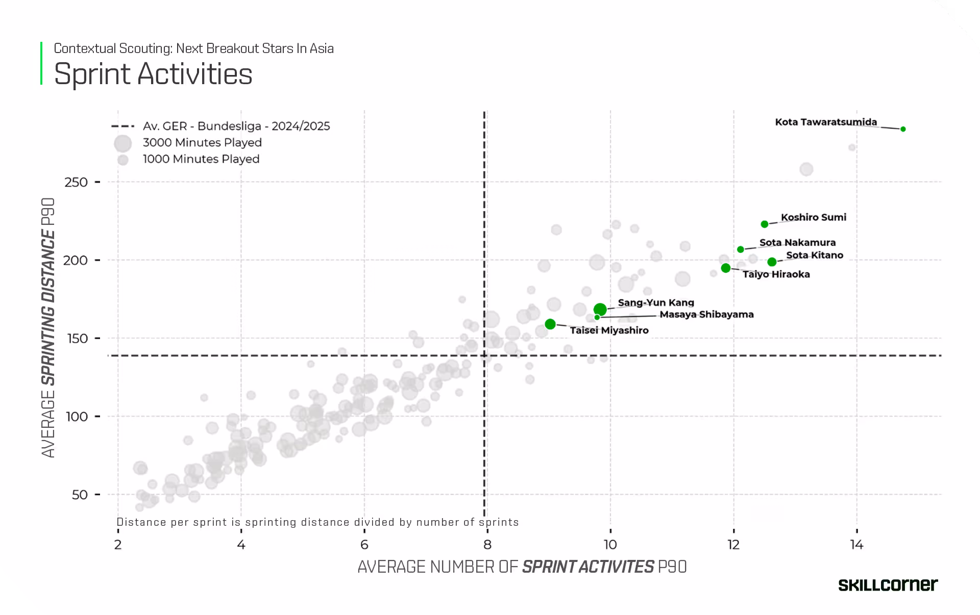 To complete our analysis, we turn to physicality. Earlier in this piece, we noted that Japanese players tend to cover large distances, although their total sprinting distance is slightly lower compared to some of the top European leagues. We now want to examine how our selected players perform in terms of sprinting activities and sprinting distance, to assess whether they can meet the physical demands of the Bundesliga.