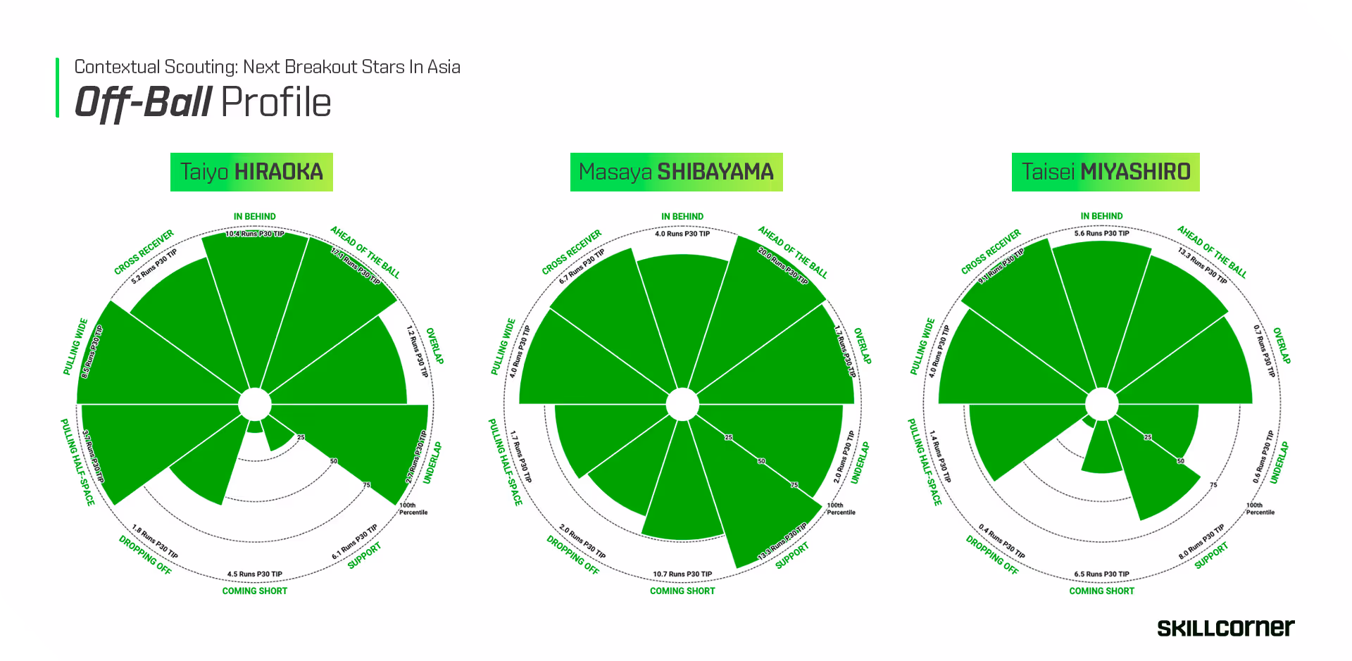 The first thing that stands out is how all of our players excel in the Movement category, each scoring at least in the 83rd percentile. When we move to Progression and Finish, scores are more modest with the exception of Shibayama who looks like a complete playmaker based on our index.