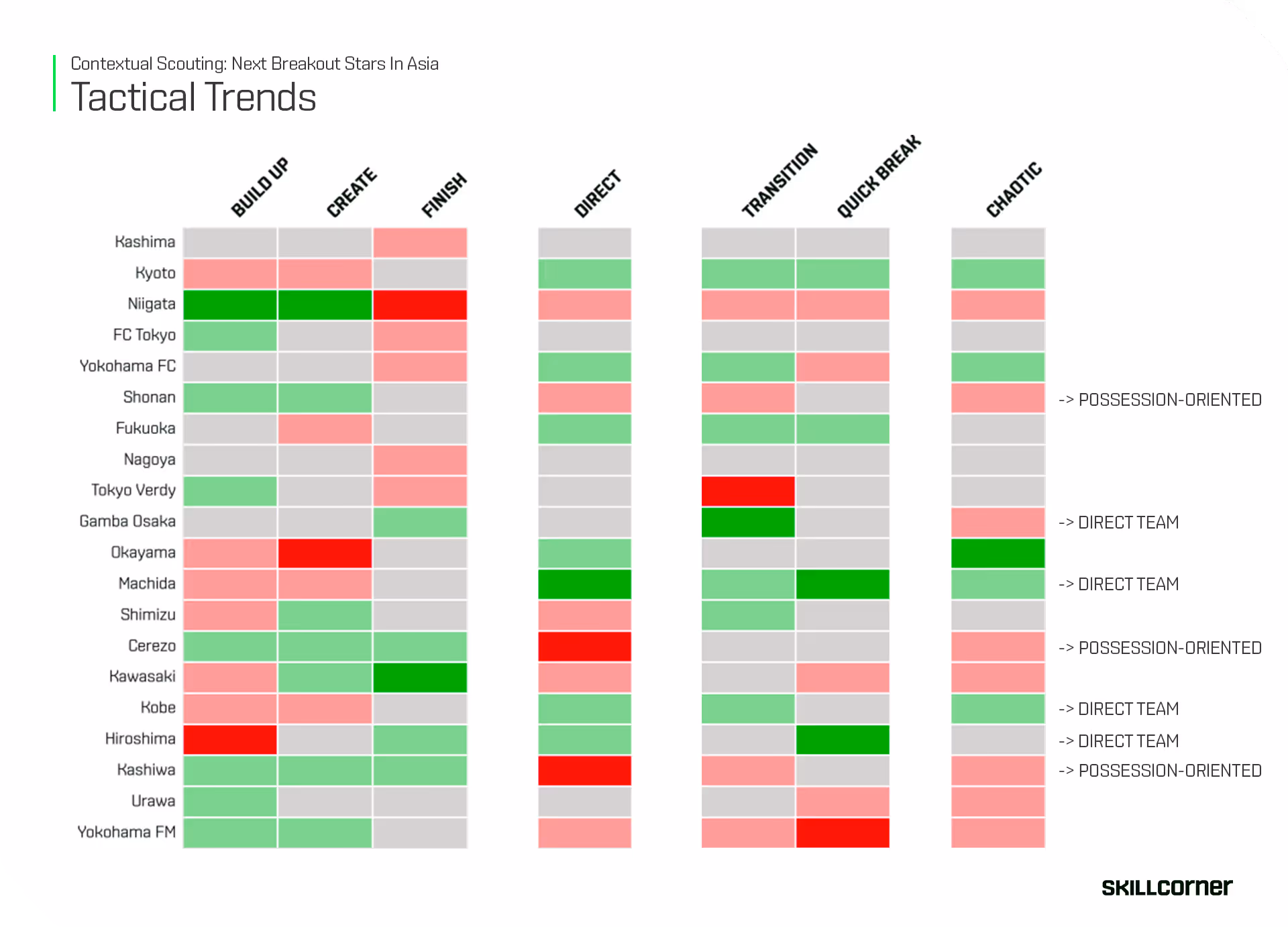 The direct teams we’ve highlighted all finished in the top four last season, with Vissel Kobe securing their second consecutive league title. What these sides have in common is a clear tendency toward directness - all of them score above average (green scores) in either Direct Play or Transitions. A few teams, however, have sought to deviate from this trend. Kashiwa Reysol, led by Spanish manager Ricardo Rodriguez, stands out as a notable example. They currently sit inside the top three and have just reached the Japanese league cup final, where they will face Sanfrecce Hiroshima, who ranks highly for direct play and quick breaks. An exciting watch for sure!