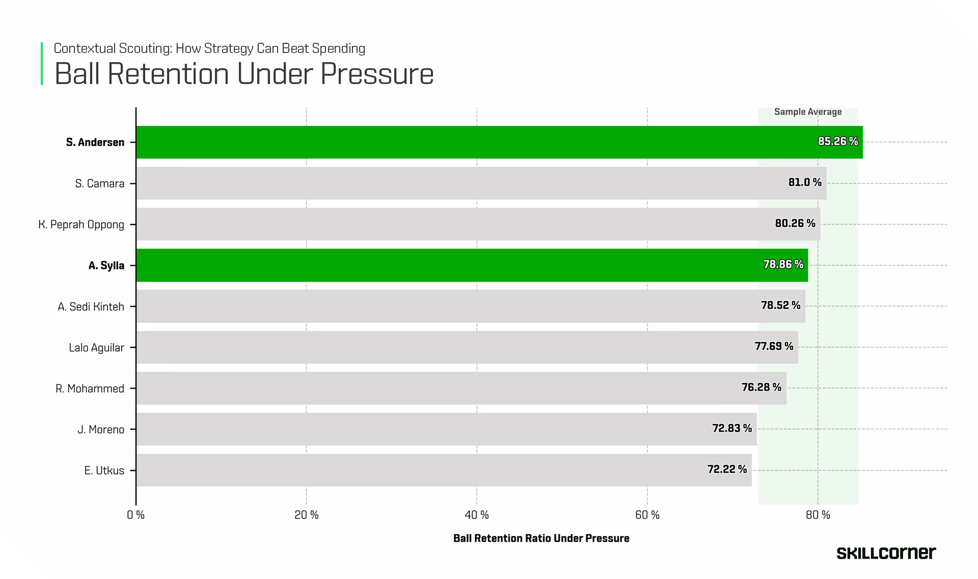 After confirming that Sylla checks the physical box, we also wanted to assess his composure and quality on the ball. While the chart below doesn’t directly measure progression, it provides some signal (which we can confirm with video scouting) of his on-ball ability, ranking inside the top five in our sample for ball retention under pressure.