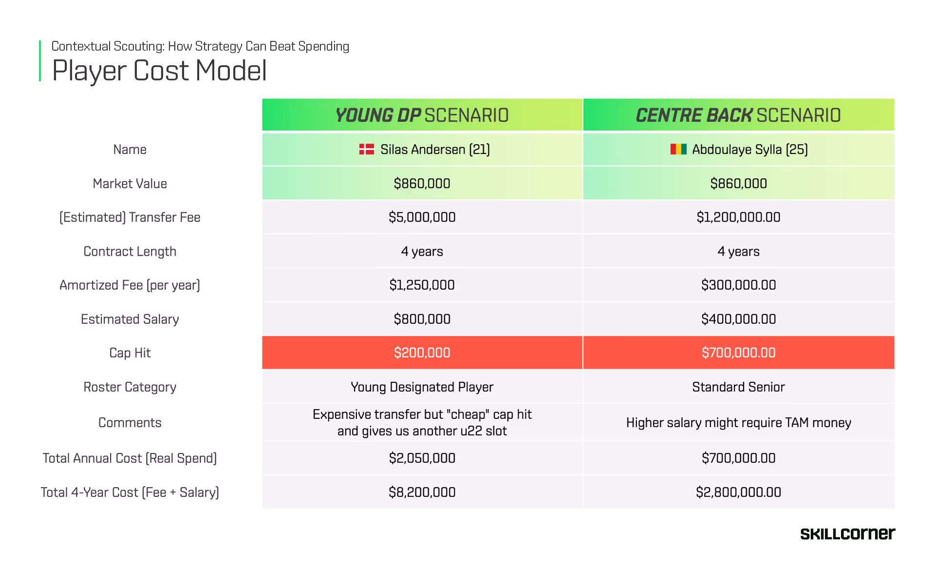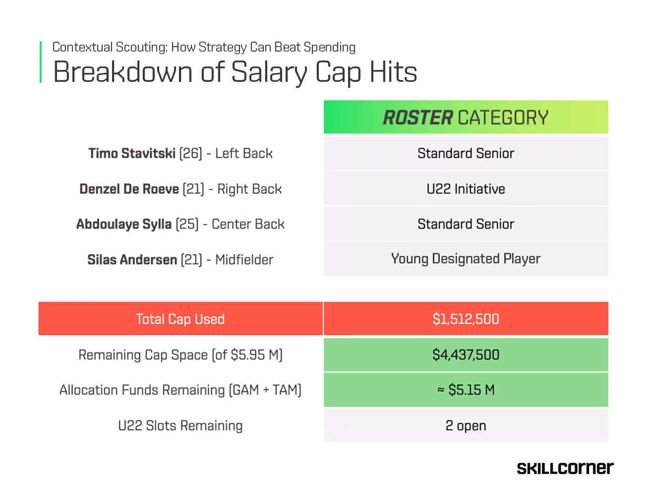 Given his age and potential, we could consider acquiring him as a Young Designated Player (Young DP). This would minimize his cap impact while also unlocking an additional U22 Initiative slot, maintaining roster flexibility for future signings. This feels like a rare opportunity to secure a player that will improve our starting XI immediately, as well as having long-term upside and strong resale value. Let’s break down the financial impact of signing Sylla for our defense and adding Andersen as a Young Designated Player: