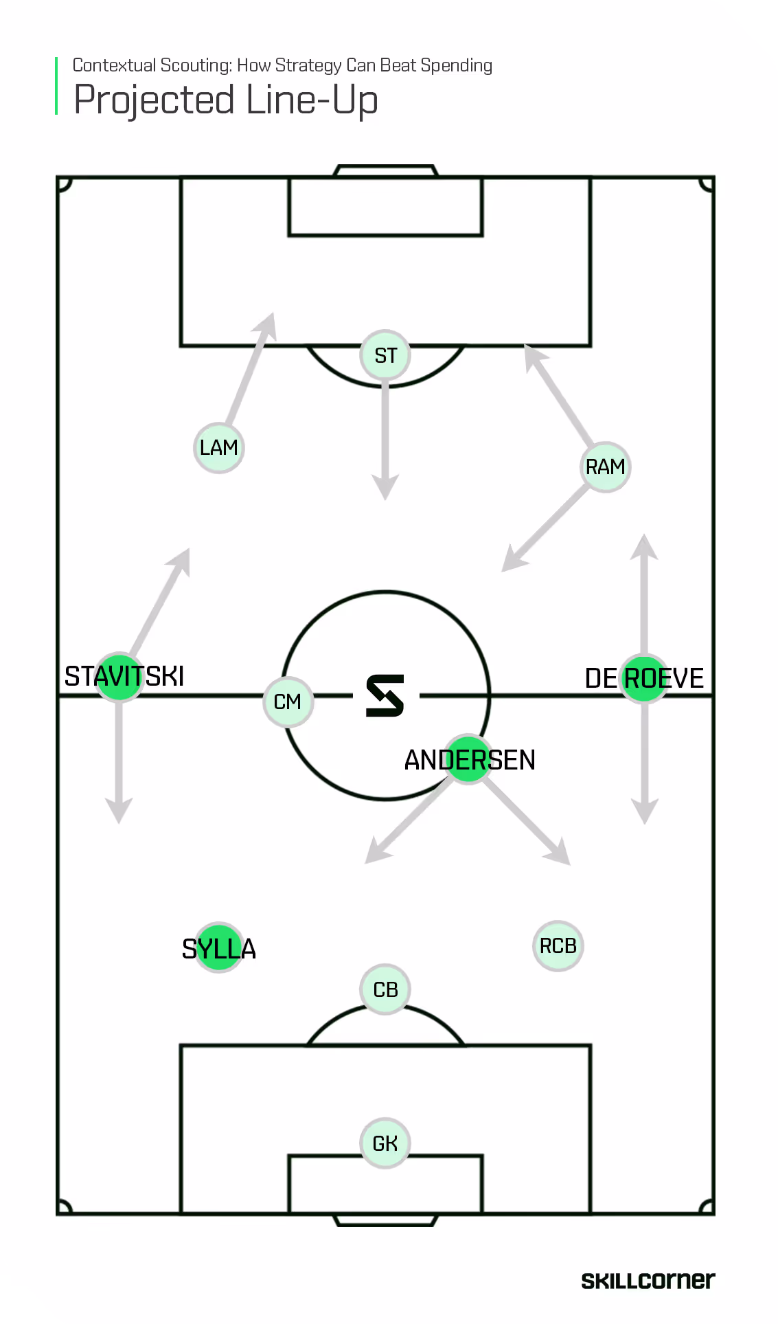 Through our contextual scouting framework, we identified four such players: Timo Stavitski, Denzel De Roeve, Abdoulaye Sylla, and Silas Andersen. Each fits a clear tactical purpose: from Stavitski’s offensive runs to Sylla’s recovery pace and Andersen’s hybrid defensive-midfield role. This is how our projected line-up looks so far: