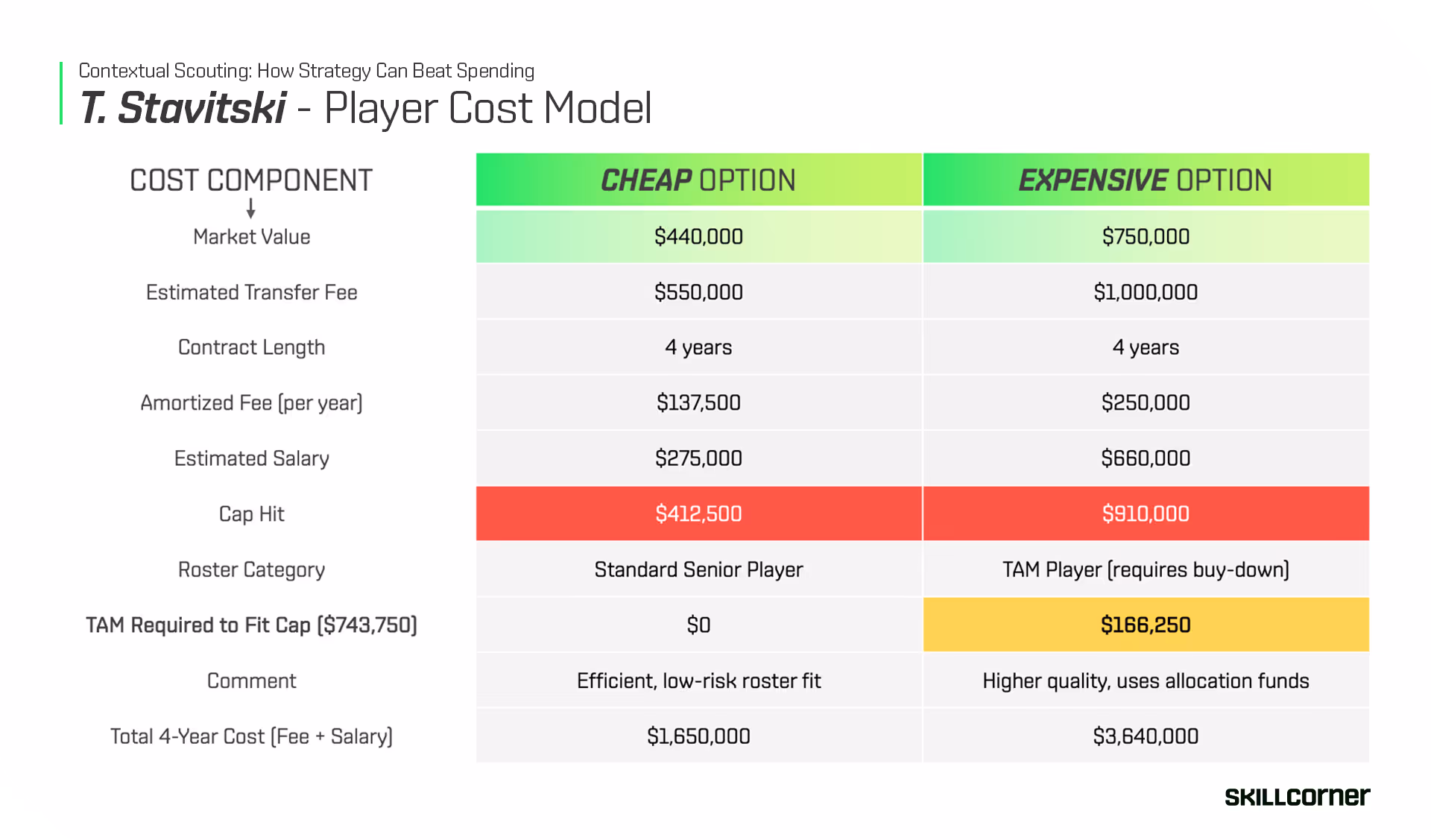 If we manage to sign Stavitski at his current market value, the table shows that his annual budget charge would remain well below the maximum budget charge. As a result, he could be registered as a standard senior player on our roster without the need to use Targeted Allocation Money (TAM).