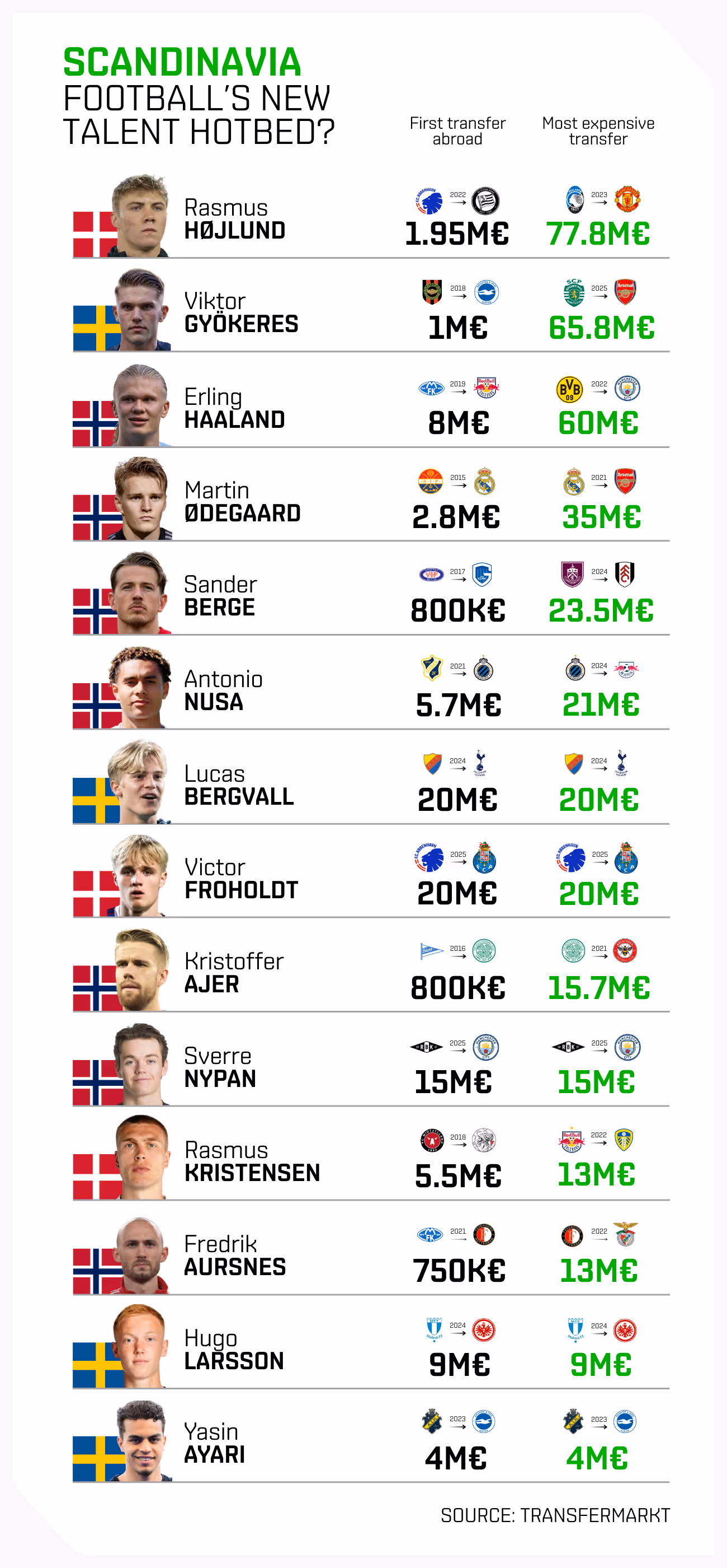 In recent years, Scandinavia has emerged as a breeding ground for top-tier talent, producing technically refined and tactically intelligent profiles. A common thread in many of these players’ journeys is the step-by-step nature of their development. Rather than jumping straight to a top-five league, they often take an intermediate step, typically to leagues like the Netherlands, Belgium or Portugal - where they can secure consistent minutes, grow in a competitive but supportive environment, and prove themselves before making the leap to a major European club. However, some clubs from the ‘Big Five’ leagues have already started to take notice, securing talent early in this market before prices increase.